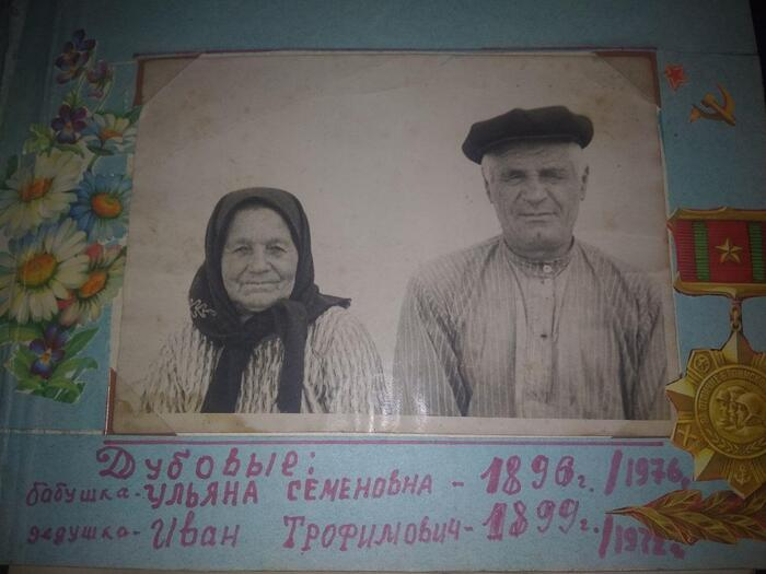 По маминой линии, Дубовой Иван Трофимович – это мой дедушка, он тоже фронтовик, воевал, сапёр, разведчик, дошел до Берлина. У него были братья, которые тоже воевали на фронте. Они были артиллеристами, снабженцами, участвовали в боевых действиях. Но вернулись все до единого, благодаря бабушкиным молитвам. Моя бабушка Дубовая Ульяна Семёновна, она была очень верующий человек. И она когда благословляла их, то сказала близким, что они все вернутся. У дедушки моего, Дубового Ивана Трофимовича был отец. Его звали Трофим. В 1905 году, несмотря на то, что он был многодетным отцом, его призвали на русско-японскую войну, где он и погиб. Его семье, оставшись без кормильца, было очень тяжело. Но они выжили благодаря своим трудам. Они проживали в селе Бараниковка, Беловодского района.